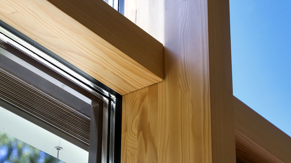 Der natürliche Baustoff Holz sorgt im Inneren für eine wohlige Atmosphäre. Die weichen Farbtöne und die fließenden Strukturen passen perfekt zu klassischen aber auch modernen Wohnstilen. Die seidenglatten Holzoberflächen werden von außen durch eine robuste Aluminium-Schale vor Witterungseinflüssen geschützt. Außerdem verstärkt das exakte und geradlinige Aluminium den eindrucksvollen Effekt und modernen Look großer Glasfassaden.